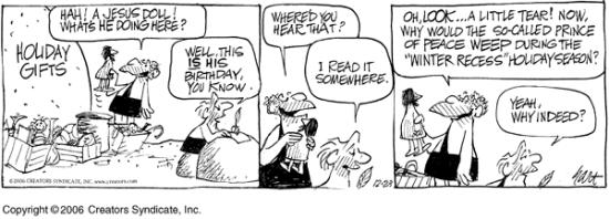 We turn the Son of God into a clown with red suit and white beard… and invest him with attendants of elves instead of angels, and a snowman who sits incongruously in 40 degree heat in many yards in the height of Australian summer.