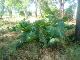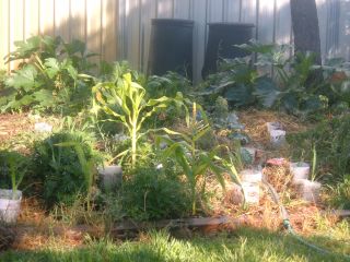Here are some photos of my vege patch. Unfortunately the trees are shading the vege patch in the afternoon- makes a lousy photo but will help protect the plants from the heat of summer. At the moment I'm growing corn (seeds haven't germinated very well until the batch I just planted out, and even they only germinated about 50%), a white-skinned water melon, tomatoes, broccoli, cucumber (self-sown from last year) and what I thought was a zucchini plant, also self-sown, but it's looking more and more like the same variety of cucumber plant. The cucumber plant is about a metre across and has produced just the one fruit so far… but that should change as the weather warms up.
