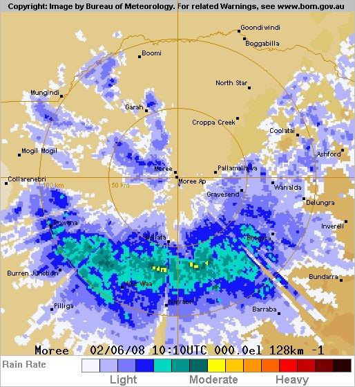 This is the latest rainfall radar picture from the Moree weather station.