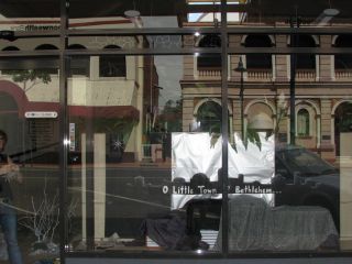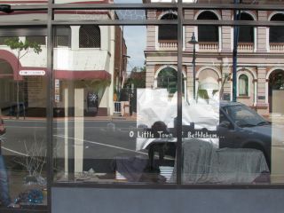 This afternoon Margaret and I went down to the main street to check out the logistics of our outreach at the Mardi Gras on Thursday. We've been given the go-ahead to do our thing outside Richard Orr's shop, so we wanted to consider the practicalities of carting stuff onto the site. We discovered Kay was putting together their window display. I had the camera so did the obvious and noticed the interesting effects of the reflection superimposing the modern on the ancient. Since the buildings in the background are banks that were built in the 1800s and renovated over the years, I guess that represents three eras.