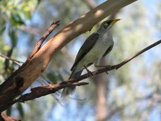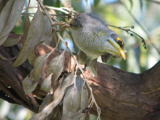 They are called noisy miners (Manorina melanocephala) and that is an accurate description. They usually have one on guard duty who squawks loudly when I come near.