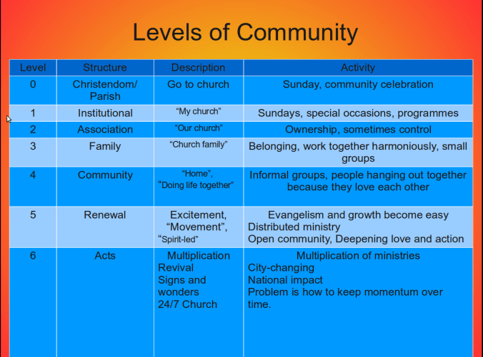At the Family Camp a few weekends ago, I talked in one of the sessions about the levels or types of christian community that exist. I prepared a slide presentation but I wasn't able to use it at the time because of technical problems.