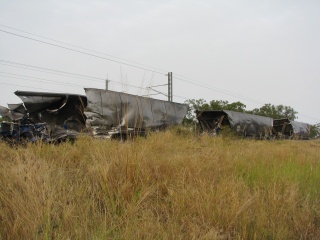 When we went to Rockhampton we were intrigued by this literal train wreck. About 20 empty coal wagons with varying extents of damage were lying beside the tracks.