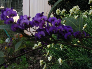 Last year we planted little daisy bushes and hardenbergias along the back wall of the church. They looked pretty good then for Susannah's wedding, but they struggled through the long dry summer. Now they have grown and and are happily flowering and they look fantastic!
