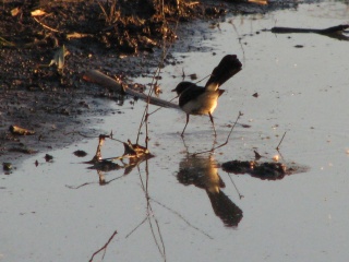 This willy-wagtail was very active, hopping along the edge of the lake then flying over the water before returning again. After about ten minutes I was able to catch him standing still long enough to take the photo.
