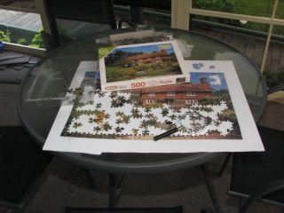 2. Both interesting shots. I think I like the puzzel the best. Something about it draws me into it. Pictures like this create more questions than they answer and cause the observer to speculate. It makes me wonder who is doing the puzzel. They must be quite well organized, they had the forethought to put a board down first and complete all the edges. And why are they doing a puzzel? They find it relaxes their mind? Re-energizes them for some challenging thinking ahead? Why that particular puzzel? Was it just there in the cupboard or did they specifically choose this one? I son't think I want to know the answers, it's just interesting to think about them.