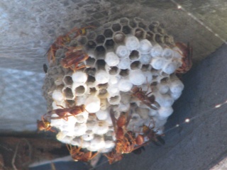 Today, after mowing the grass, I noticed there is a particularly active paper wasp nest on our verandah. These wasps are particularly aggressive and pack a nasty punch. I'm told that the Farm Centre sells a spray that packs a strong punch, so guess where I'm going on Friday. In the past I have used a burning piece of paper to set fire to the nest, but there seem to be too many wasps to risk that.