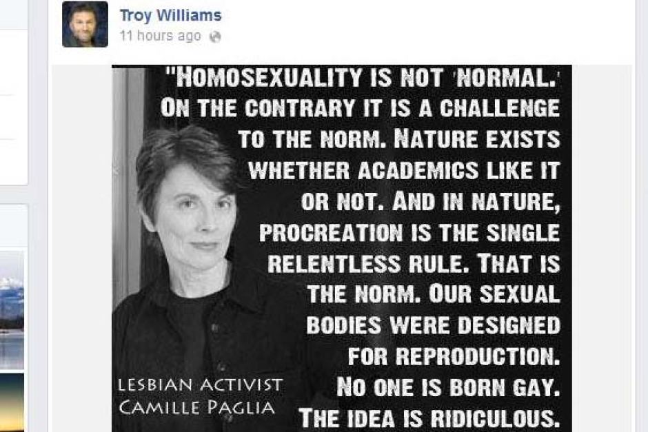 A Hobart school chaplain and Council Youth worker has been sacked from both of his jobs for posting the following picture on his facebook page- note the attribution.