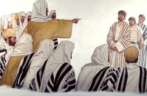 The Council orders Peter and John to stop speaking in the name of Jesus. Peter replies, “Judge for yourselves whether we should obey you or obey God.”