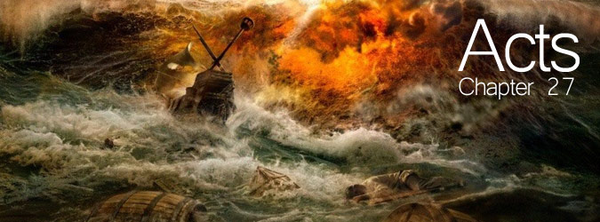 About midnight on the fourteenth day of the storm, it appears that the ship will be driven onto rocks. Some of the sailors try to abandon the ship, but Paul tells the commanding officer that they will all die unless the sailors stay on board. The soldiers then cut the rope to the lifeboat.