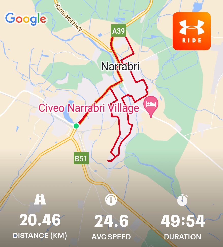 Today’s Bike Ride January 26, 2023 / newlifenarrabri A good ride around town out past Bunnings, the railway station and down Riverbend. We live in a beautiful town. #narrabri #cycling Share this: Click to share on X (Opens in new window) X Click to share on Facebook (Opens in new window) Facebook More Click to print (Opens in new window) Print Click to share on Reddit (Opens in new window) Reddit Click to email a link to a friend (Opens in new window) Email Like Loading... Related