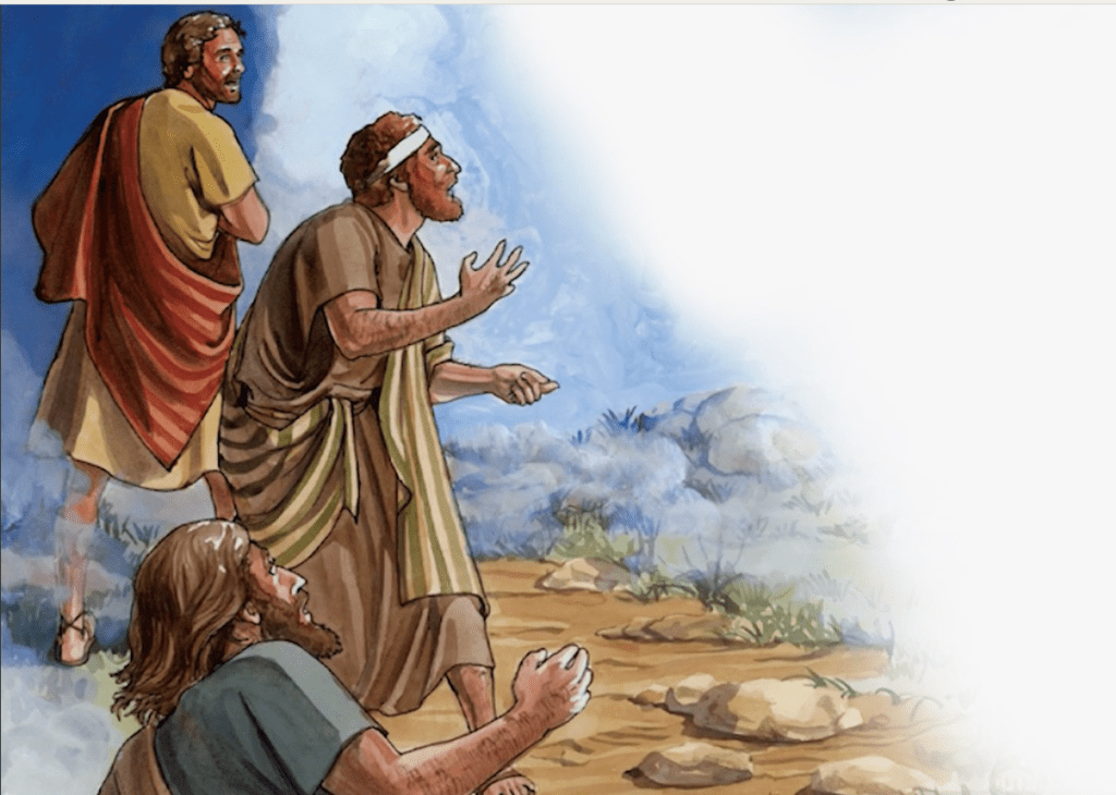 Jesus takes Peter, James and John up a high mountain to be alone. Jesus’ appearance is transformed, and His face shines like the sun. Moses and Elijah also appear.