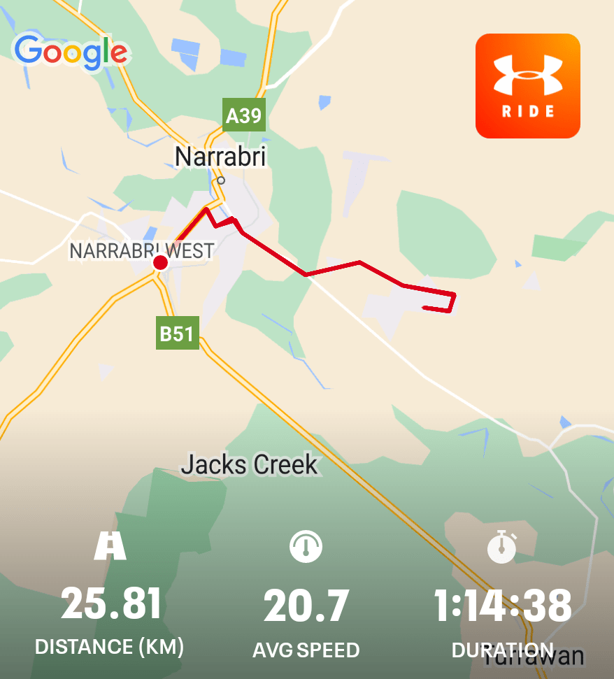 Today’s Bike Ride November 18, 2023 / newlifenarrabri First ride in a couple of weeks. Nice ride to the end of Haire Drive #cycling #Narrabri #Biketooter Share this: Share on X (Opens in new window) X Share on Facebook (Opens in new window) Facebook More Print (Opens in new window) Print Share on Reddit (Opens in new window) Reddit Email a link to a friend (Opens in new window) Email Like Loading... Related