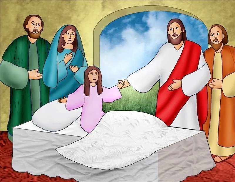 At the official’s home, Jesus removes the mourners. He then takes the girl by the hand, and she stands up.