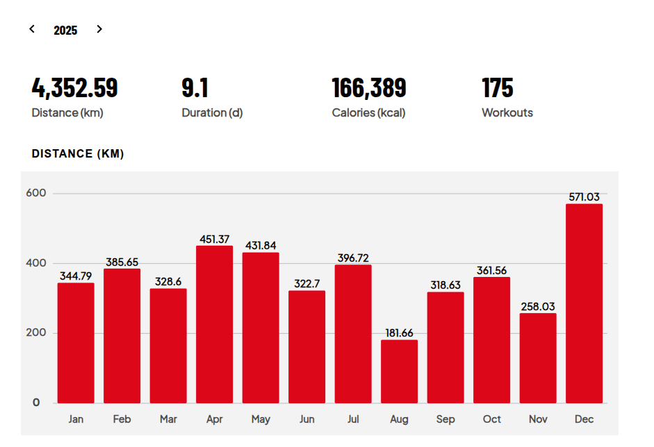 My Bike Rides in 2025 January 2, 2026 / newlifenarrabri Quite a bit short of my best year, but still quite respectable in terms of distance covered and hours enjoyed on the bike. Share this: Click to share on X (Opens in new window) X Click to share on Facebook (Opens in new window) Facebook More Click to print (Opens in new window) Print Click to share on Reddit (Opens in new window) Reddit Click to email a link to a friend (Opens in new window) Email Like Loading... Related