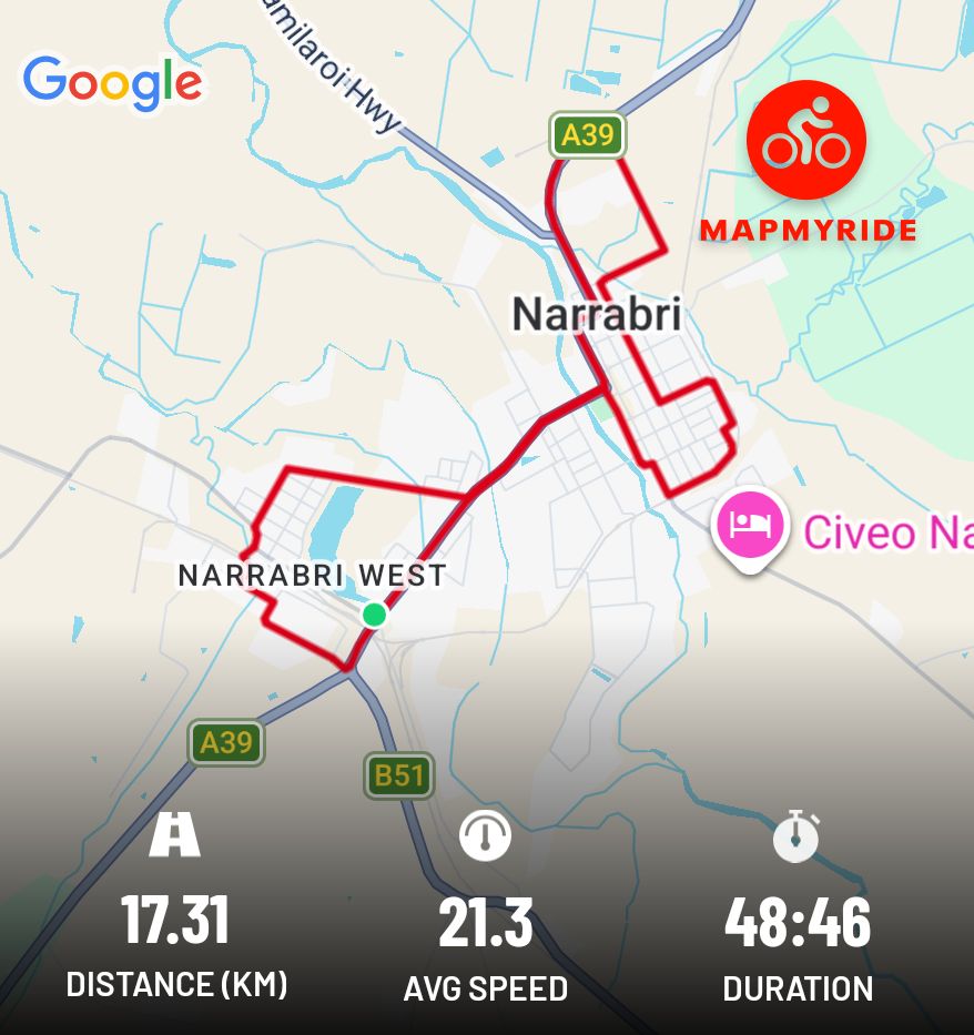 A fantastic ride this morning. I rode to Bunnings then around the edge of town and then up Ugoa St past the lake and to Railway St before coming home. #Narrabri #cycling