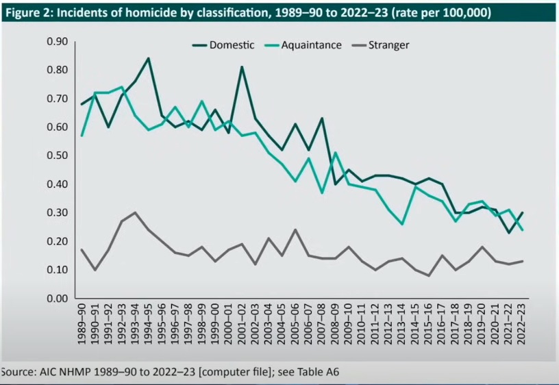 Firstly the rate of murders in Australia per population is declining, and has been for many years.