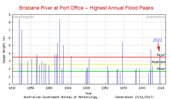 Thanks to Cliff Ollier and Ken Stewart for the BOM graph of past Brisbane Floods. Clearly things were worse in the 1800s.
